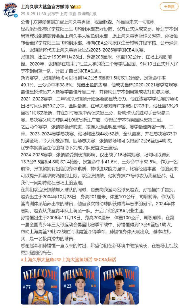 经我俱乐部与辽宁沈阳三生飞豹俱乐部友好协商,双方正式达成交易。原辽宁本钢男篮球员张镇麟转会至上海久事大鲨鱼俱乐部,原上海久事男篮球员赵森、孙福恒转会至辽宁沈阳三生飞豹俱乐部。待向CBA公司报送注册材料并经审核、公示通过后,张镇麟将代表上海久事男篮征战2025-2026赛季的CBA联赛。