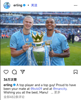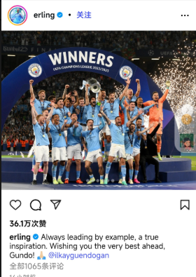 雷速体育9月6日讯 今夏的转会窗,曼城三位功勋球员离队,分别是京多安、埃德森以及阿坎吉,今天哈兰德则在社媒向这三位球员告别。